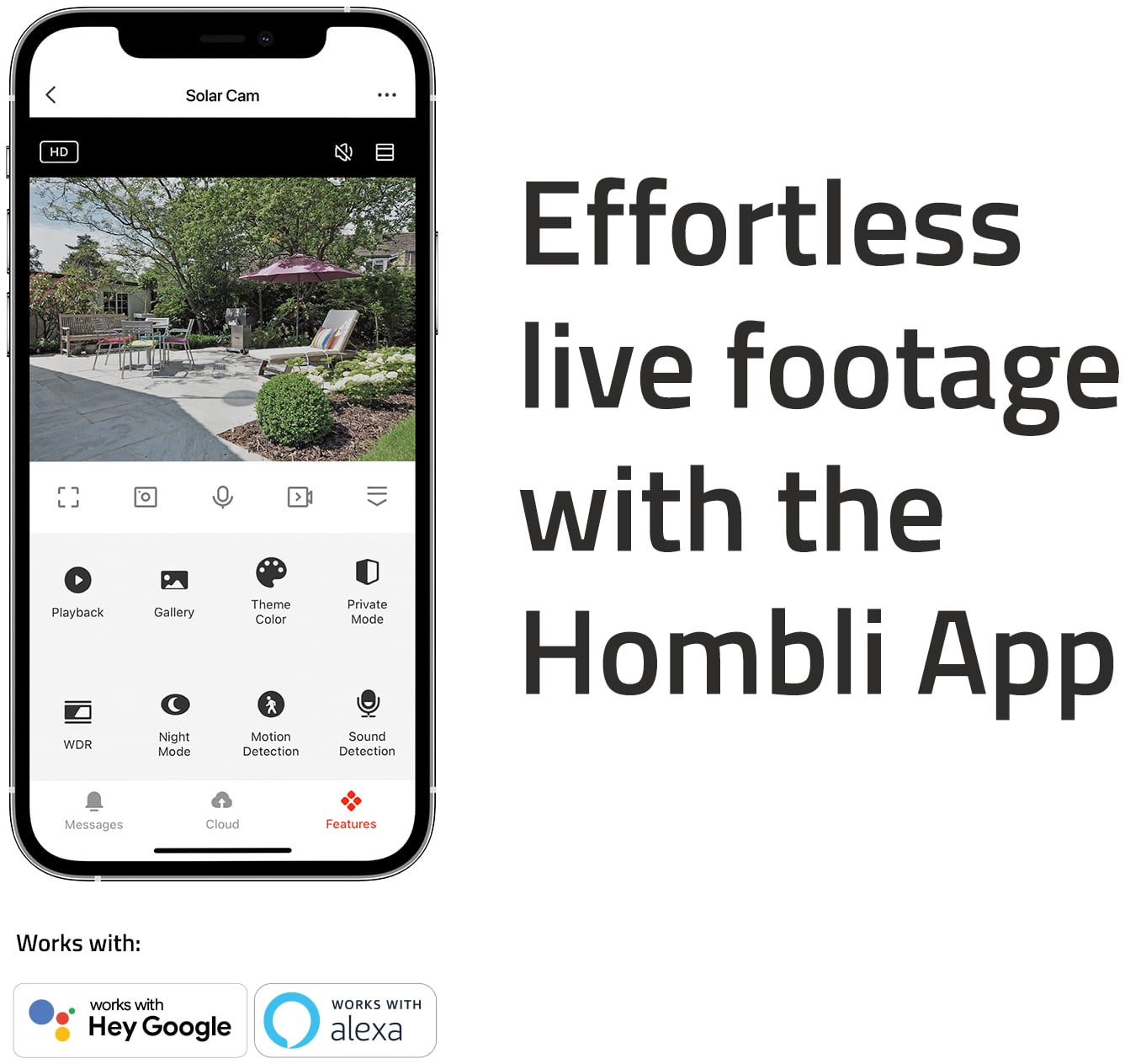 Installationen är enkel - placera fästet, koppla in, starta och anslut till ditt Wi-Fi med Hombli-appen. Den användarvänliga appen ger dig full kontroll över kameran. Vill du snabbt kontrollera och se något när du är bortrest? Inga bekymmer. Gå till appen och se live vad som händer var du än är.