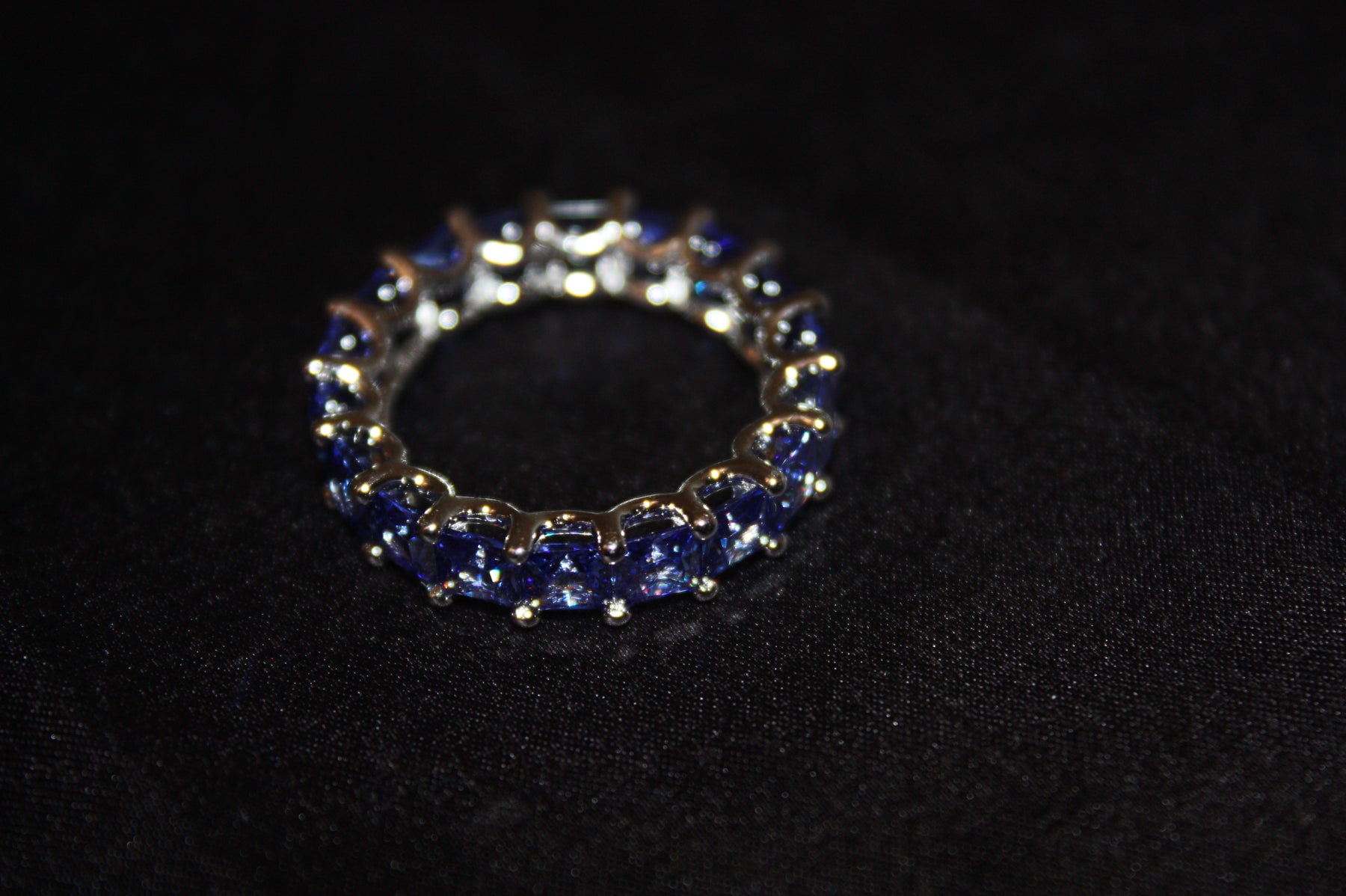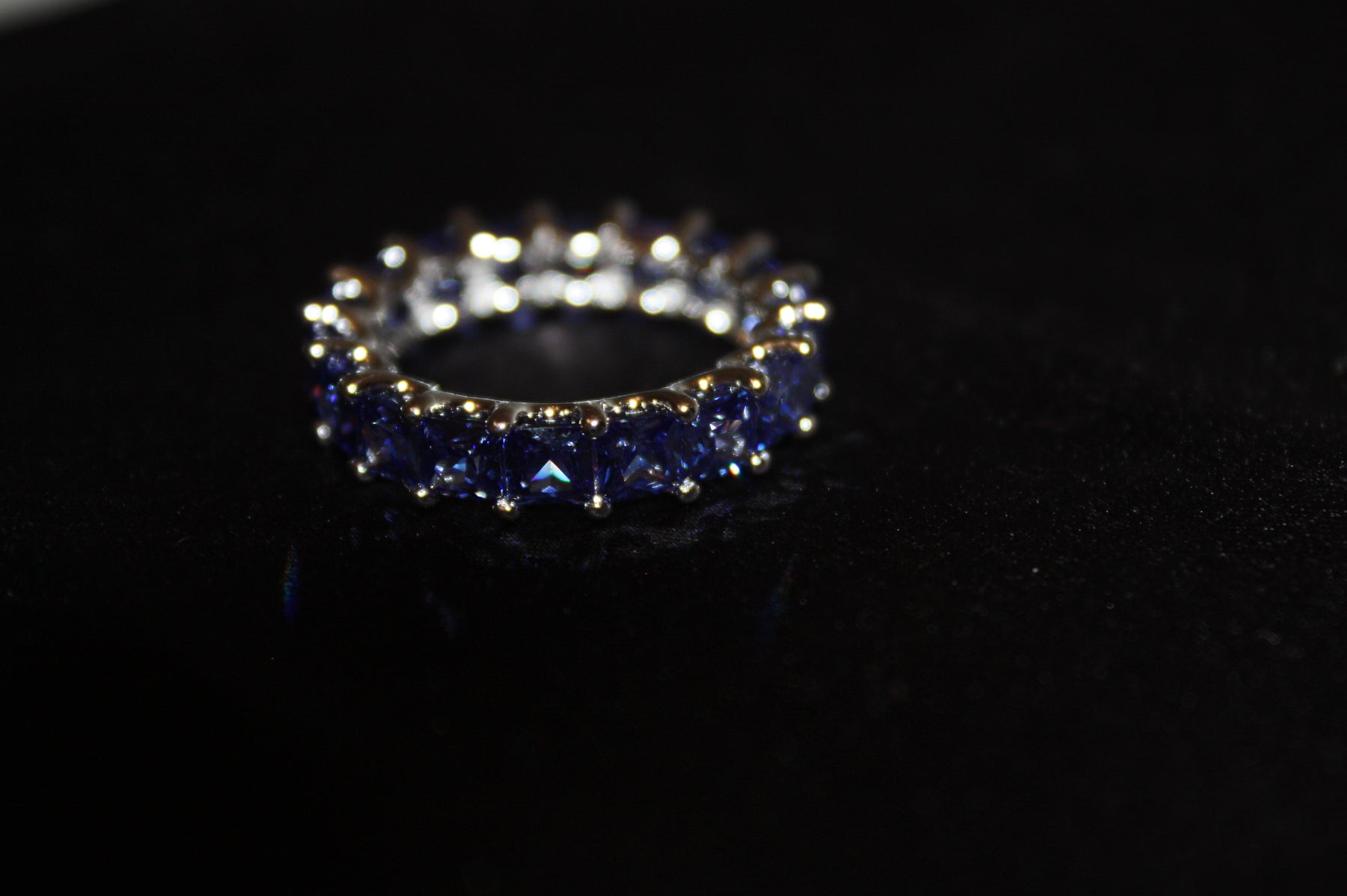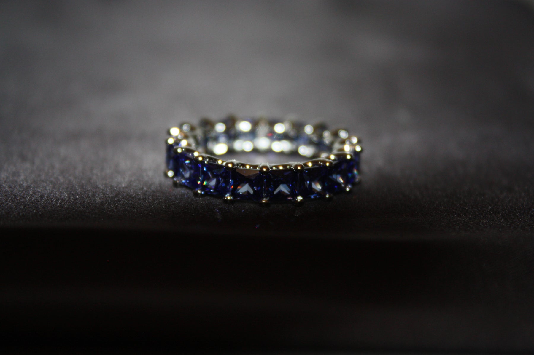Låt elegansen tala med vår "Celeste" – en gnistrande silverring prydd med safirblå, kvadratslipade stenar som löper runt hela bandet. Med sin rika färg och tidlösa design är denna ring ett glamoröst statement både till vardags och till fest. Tillverkad i äkta 925 sterling silver med en vikt på 5,84g och tillgänglig i storlekarna 7, 8 och 9.