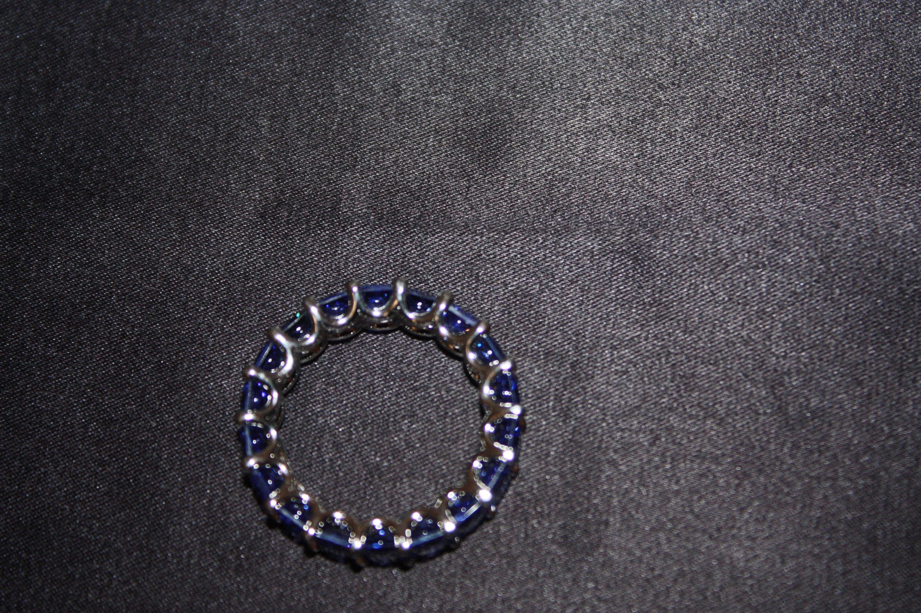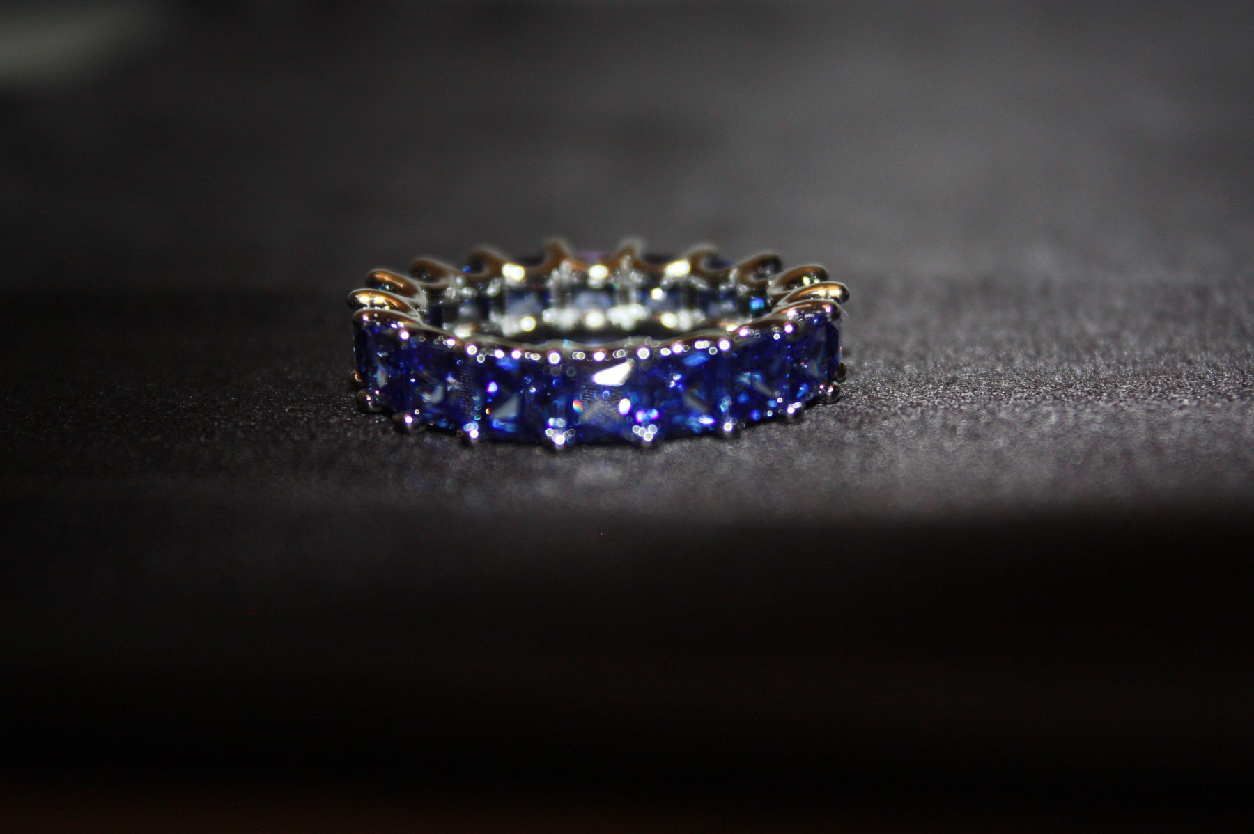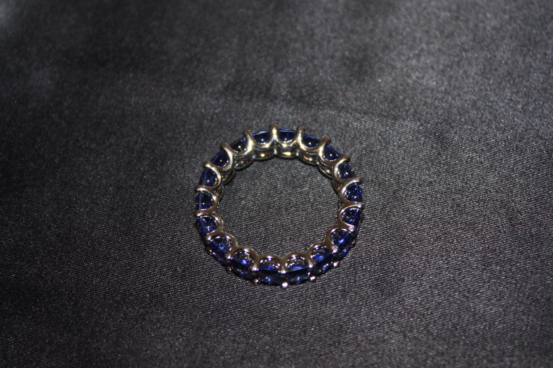 Låt elegansen tala med vår "Celeste" – en gnistrande silverring prydd med safirblå, kvadratslipade stenar som löper runt hela bandet. Med sin rika färg och tidlösa design är denna ring ett glamoröst statement både till vardags och till fest. Tillverkad i äkta 925 sterling silver med en vikt på 5,84g och tillgänglig i storlekarna 7, 8 och 9.