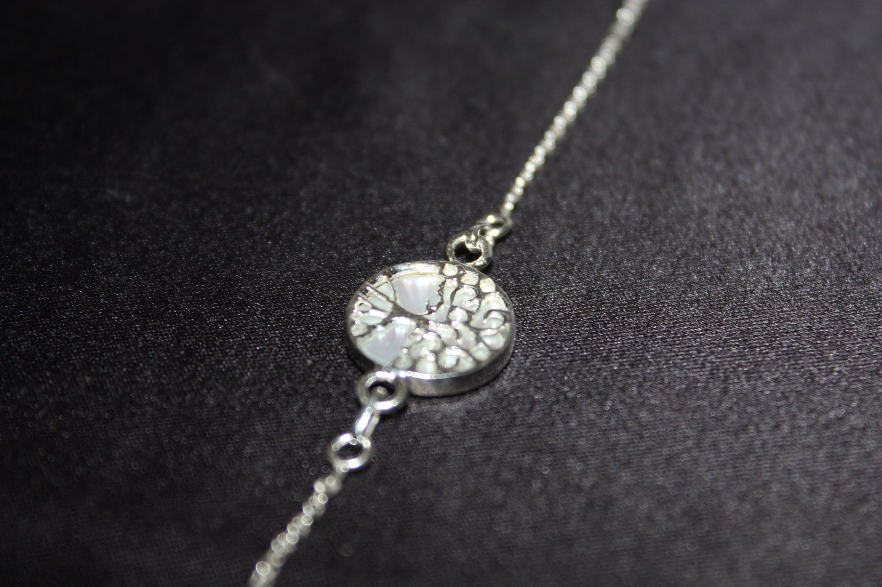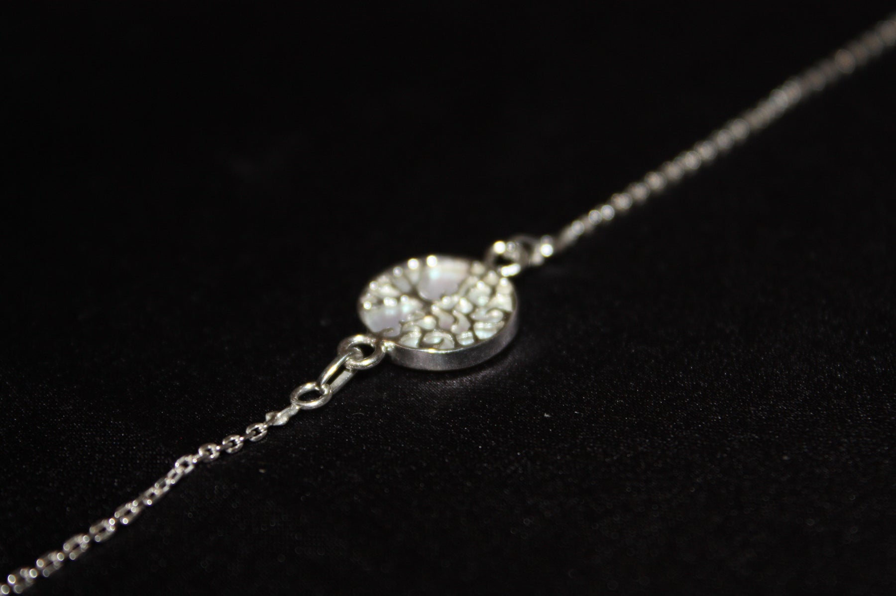 Låt naturens skönhet omfamna din stil med Luna Marea. Ett delikat armband i äkta 925 silver, där en mjukt skimrande pärlemorinläggning möter det tidlösa "Livets träd" – ett symboliskt motiv som för tankarna till styrka, balans och livets kretslopp.