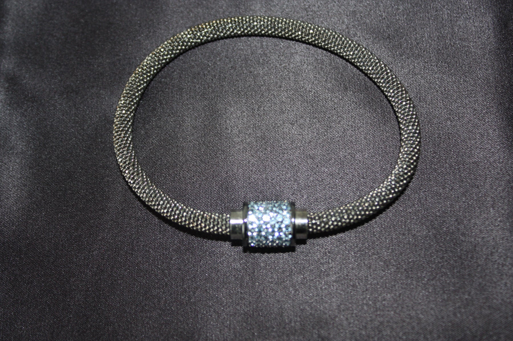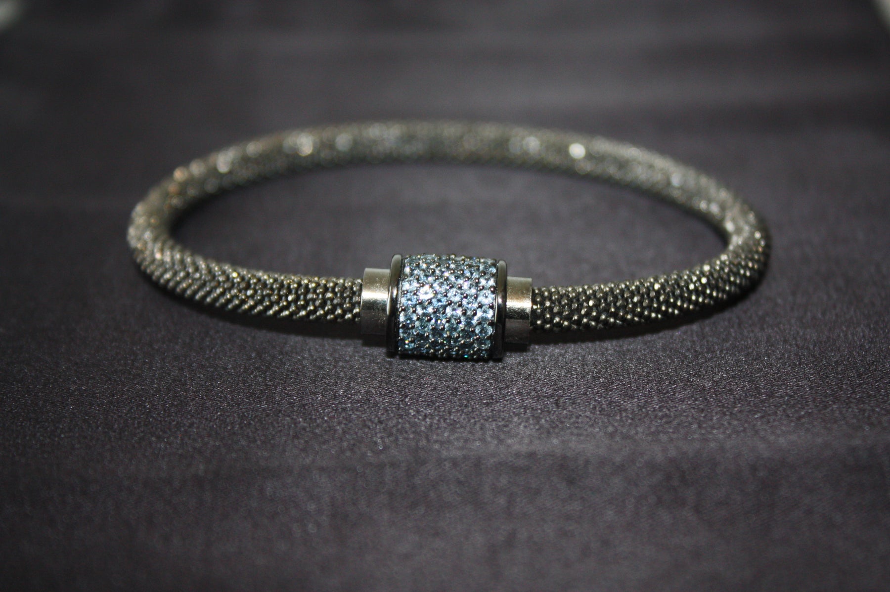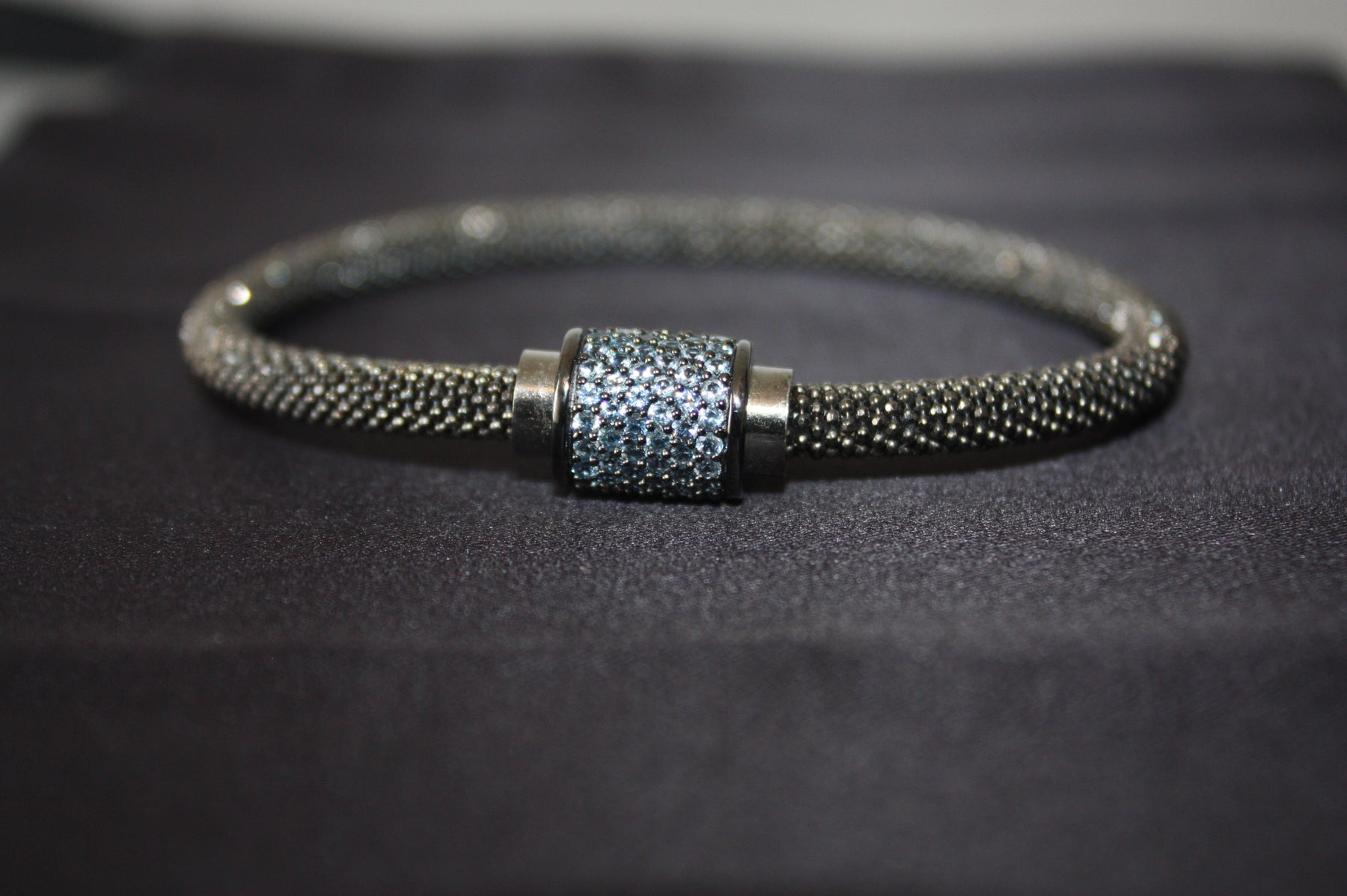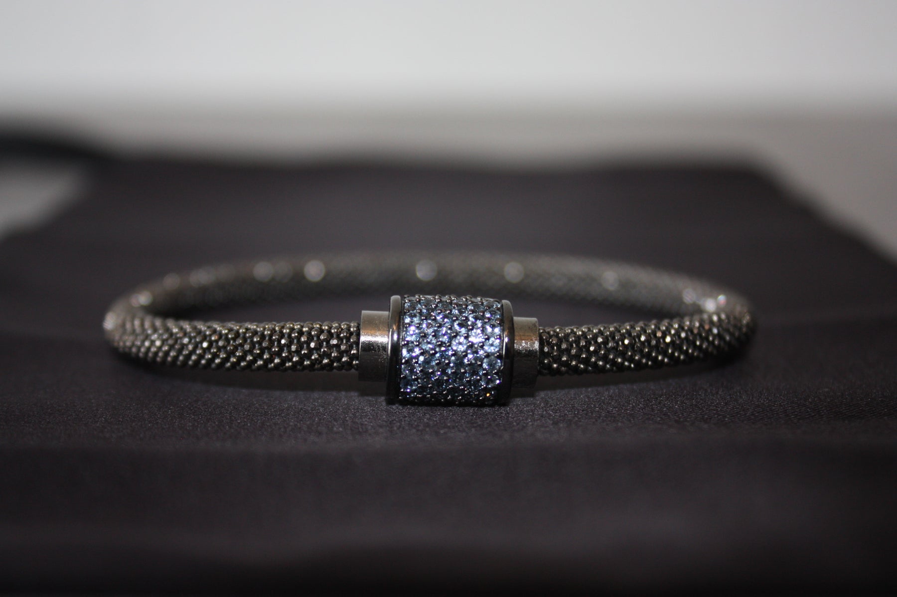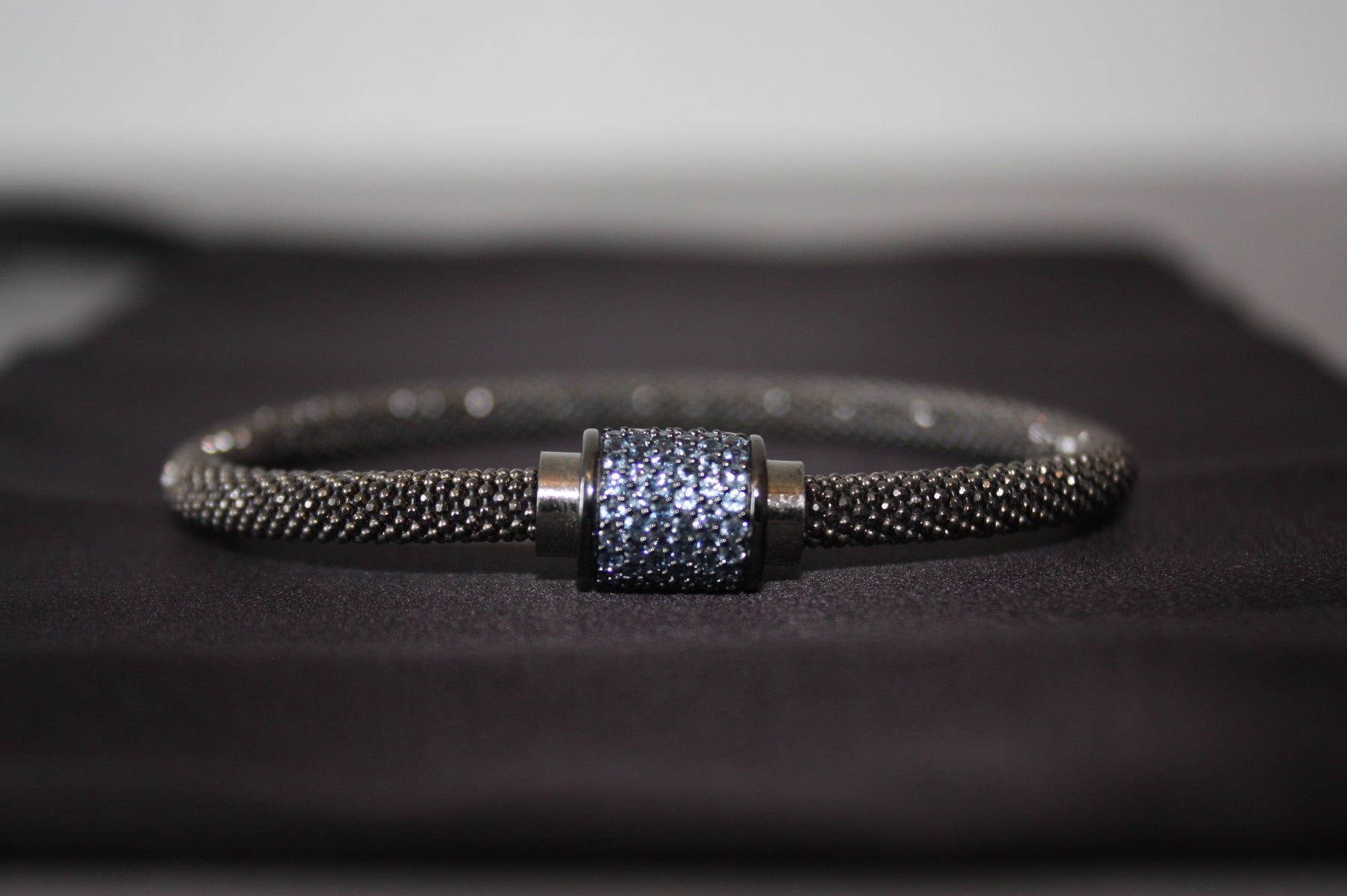 Upptäck den eleganta kraften i Midnight Ice – ett armband som utstrålar modern lyx och raffinerad karaktär. Tillverkat i äkta 925 sterling silver och prytt med gnistrande blå kristaller i en pavéinfattning, kombinerar detta smycke både styrka och skönhet i varje detalj. Den svarta mesh-designen ger en subtil kontrast mot det isblå skimret, vilket gör armbandet till en perfekt accessoar för både vardag och fest.