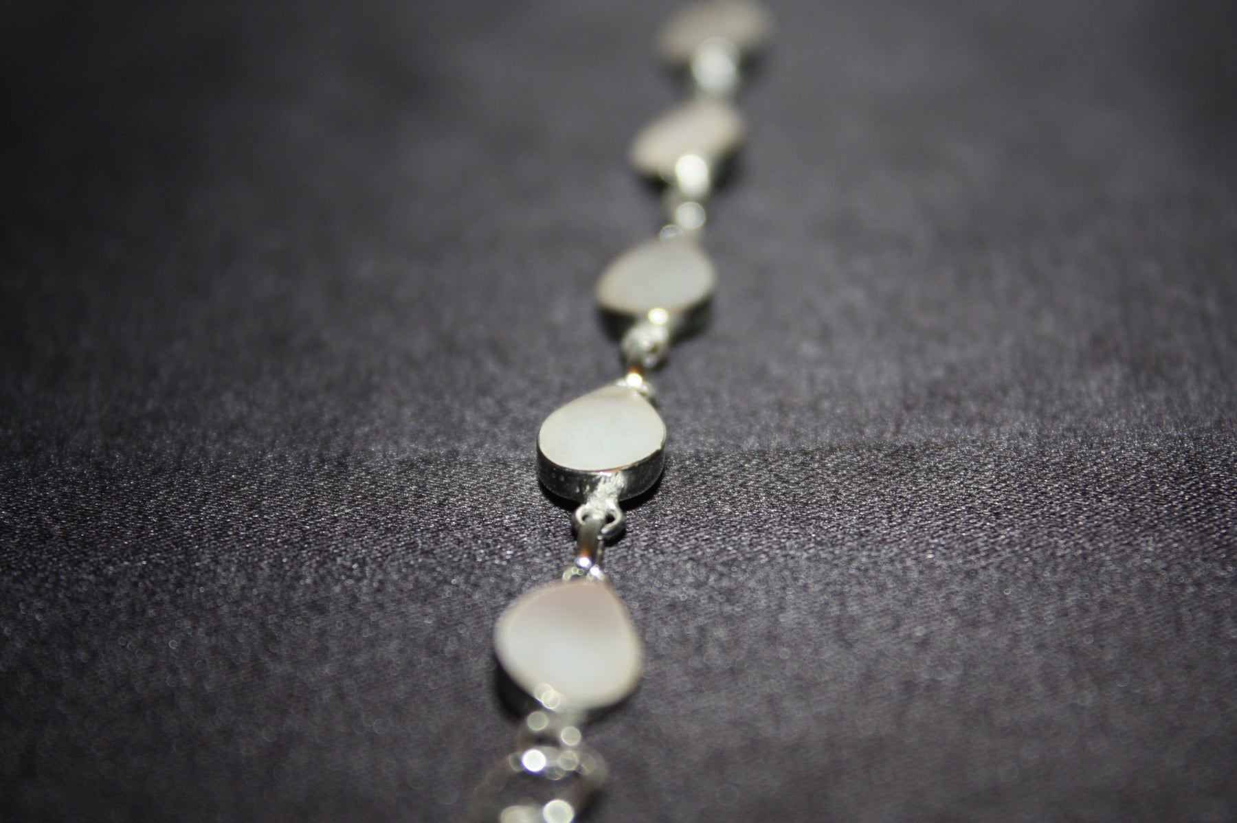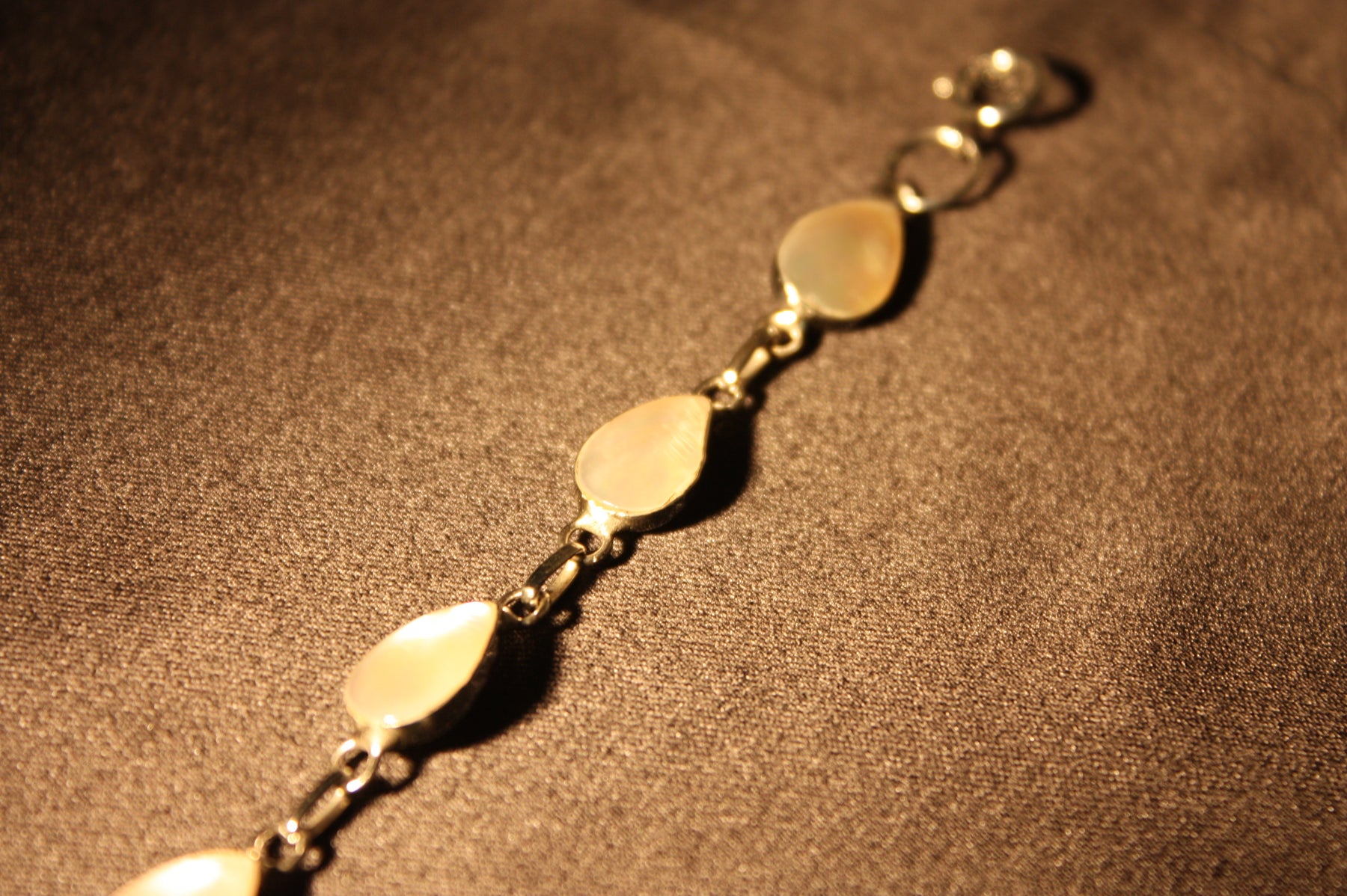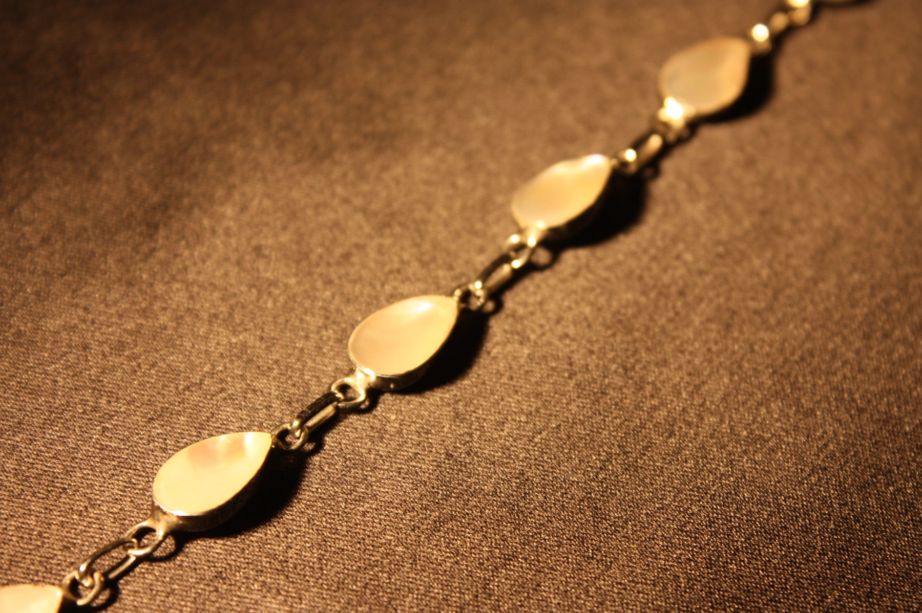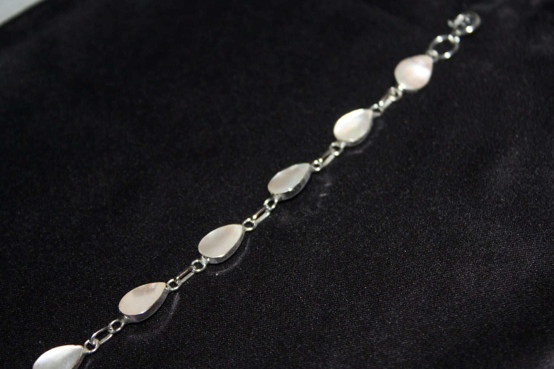 Upptäck skönheten i enkel elegans med vårt "Moonlight Teardrops"-armband – ett utsökt smycke tillverkat i äkta 925 sterling silver. Varje droppformad länk är smyckad med skimrande pärlemor, vars mjuka lyster fångar ljuset likt månsken mot vatten. Med sin lätta vikt på endast 3,8g är det perfekt att bära både till vardags och fest.