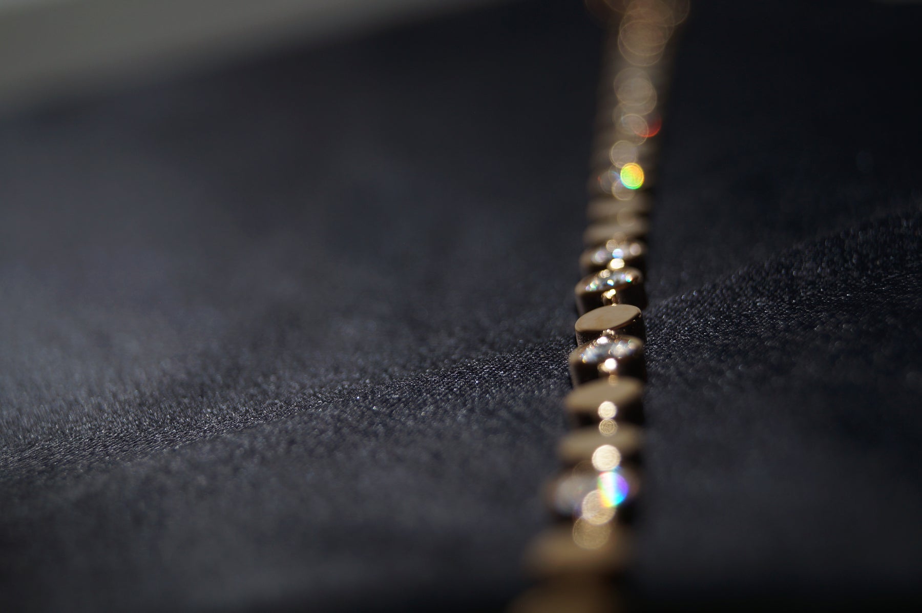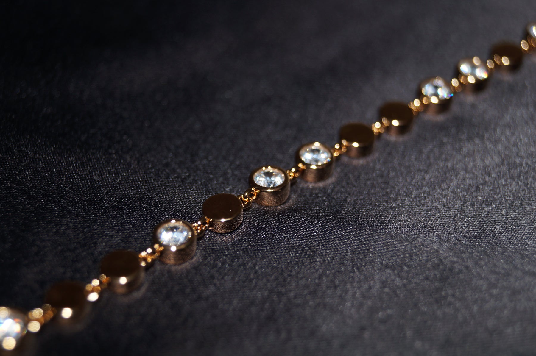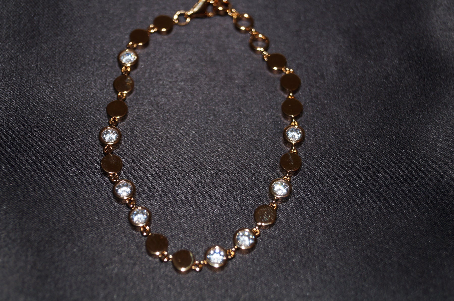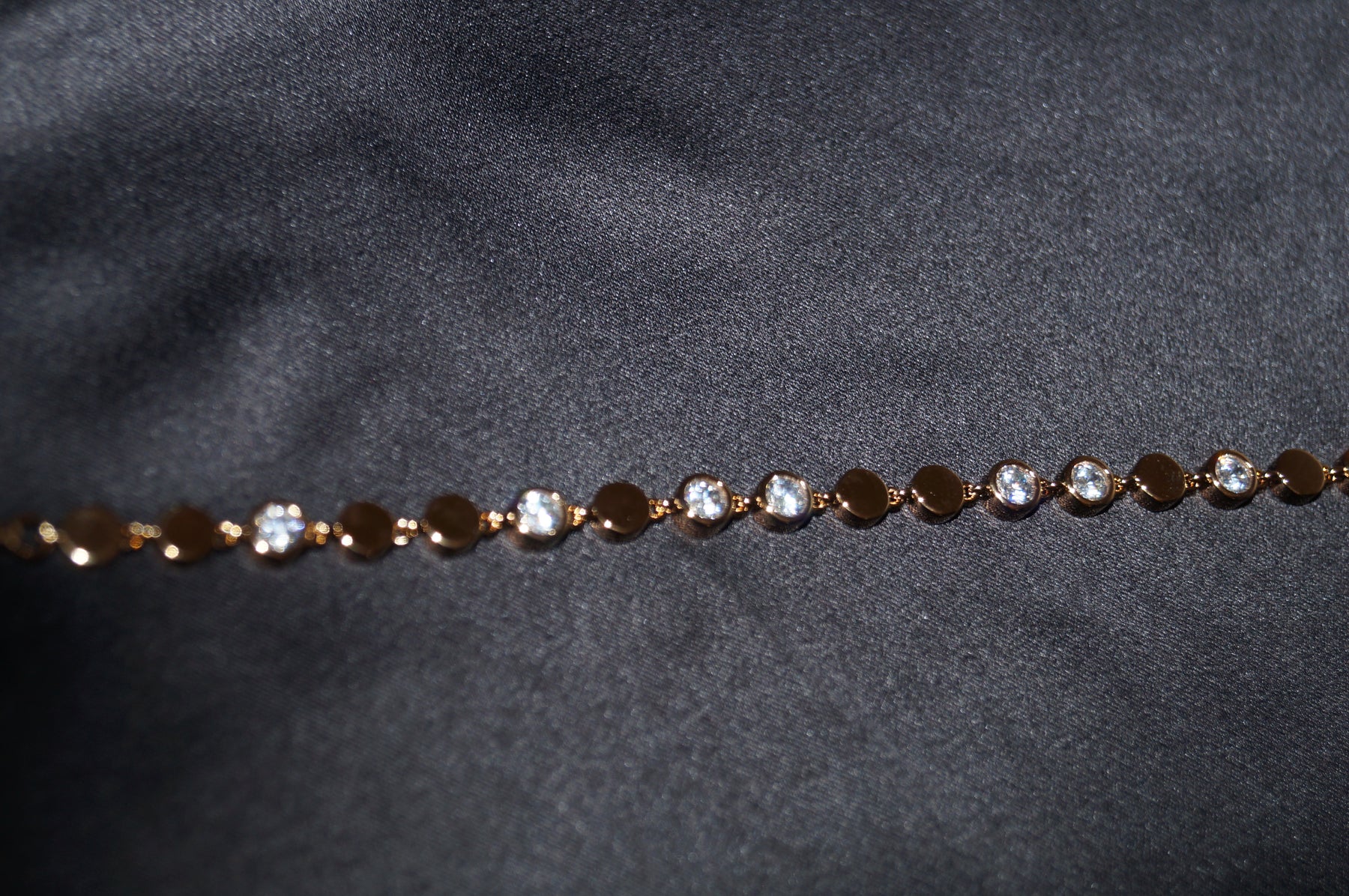 Designen växlar mellan blanka runda plattor och skinande stenar i en perfekt balans mellan minimalism och lyx. Med en vikt på 8,46 gram känns armbandet både robust och följsamt mot handleden – ett statement som är lika bekvämt som bländande vackert.